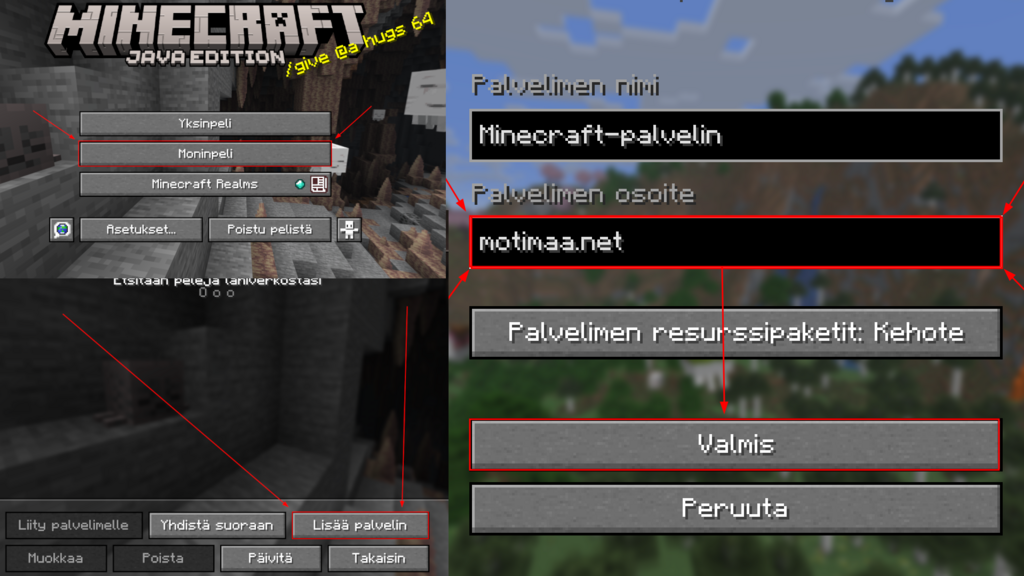 Mikäli pelaat Minecraft java -versiota, osoitteesi on motimaa.net ja mikäli pelaat konsolilla/puhelimella tai Minecraft bedrockkia, osoitteesi on bedrock.motimaa.net